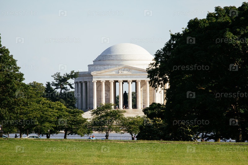 Мемориал Джефферсона, обрамленный деревьями в солнечный день в Вашингтоне, США, знаковая неоклассическая достопримечательность