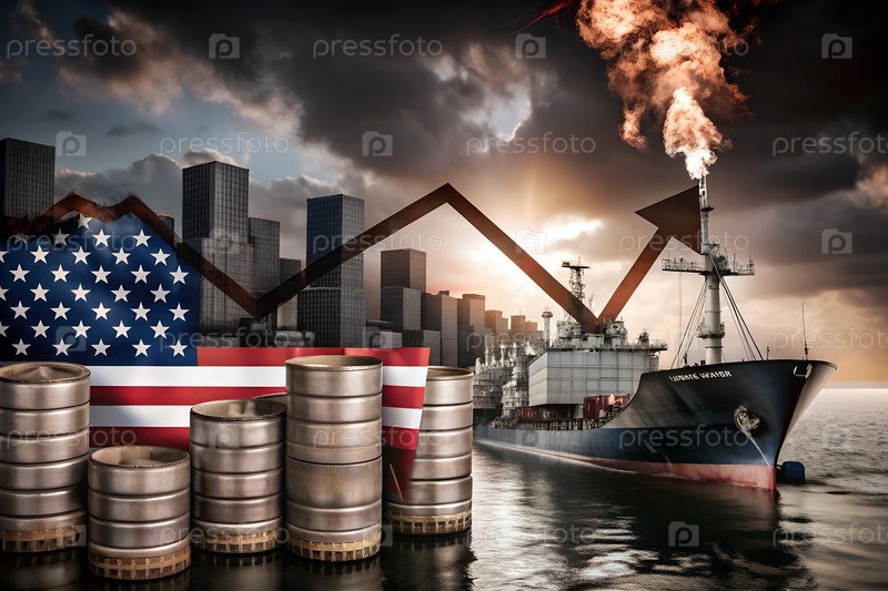 Редакционная иллюстрация энергетического конфликта США, баррелей нефти и горящего НПЗ, символизирующих геополитическую напряженность и войну