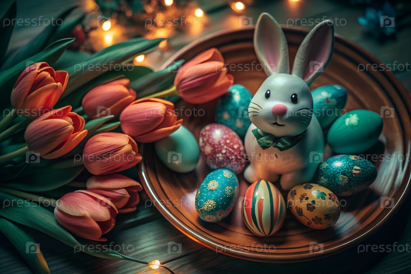 Пастельные пасхальные яйца, тюльпаны и милое украшение кролика на светлом фоне, весенние праздники плоская композиция. g