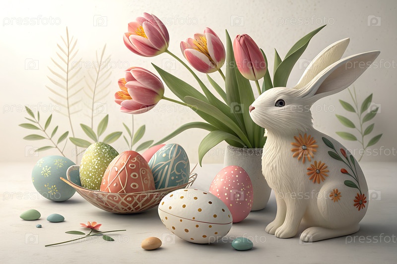 Пастельные пасхальные яйца, тюльпаны и милое украшение кролика на светлом фоне, весенние праздники плоская композиция. g