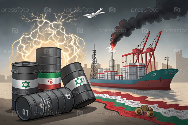 Редакционная иллюстрация энергетического конфликта США, баррелей нефти и горящего НПЗ, символизирующих геополитическую напряженность и войну