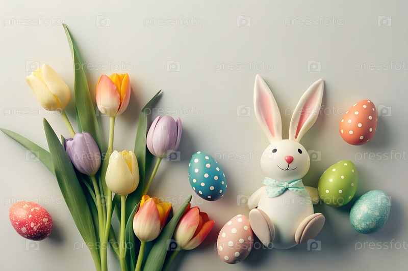 Пастельные пасхальные яйца, тюльпаны и милое украшение кролика на светлом фоне, весенние праздники плоская композиция. g