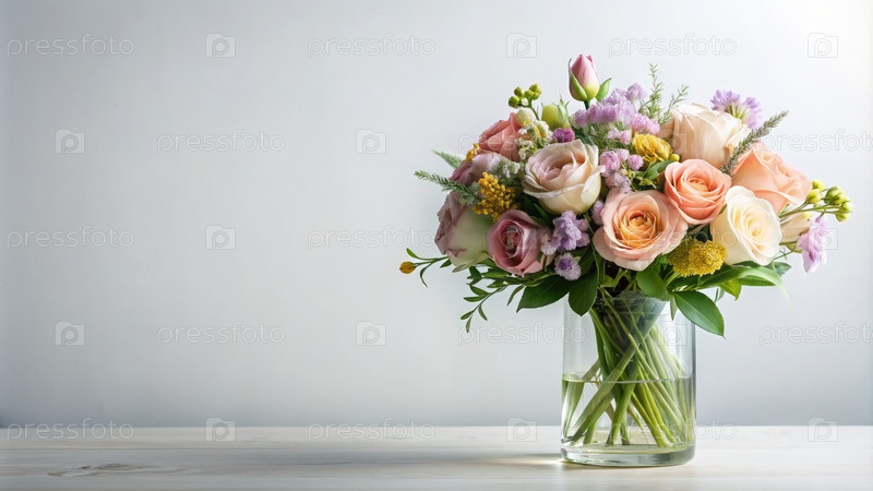 Деликатный букет розовых, персиковых и белых роз в стеклянной вазе на белом столе