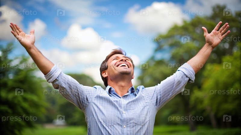 Радостный мужчина празднует на свежем воздухе с поднятыми высоко руками