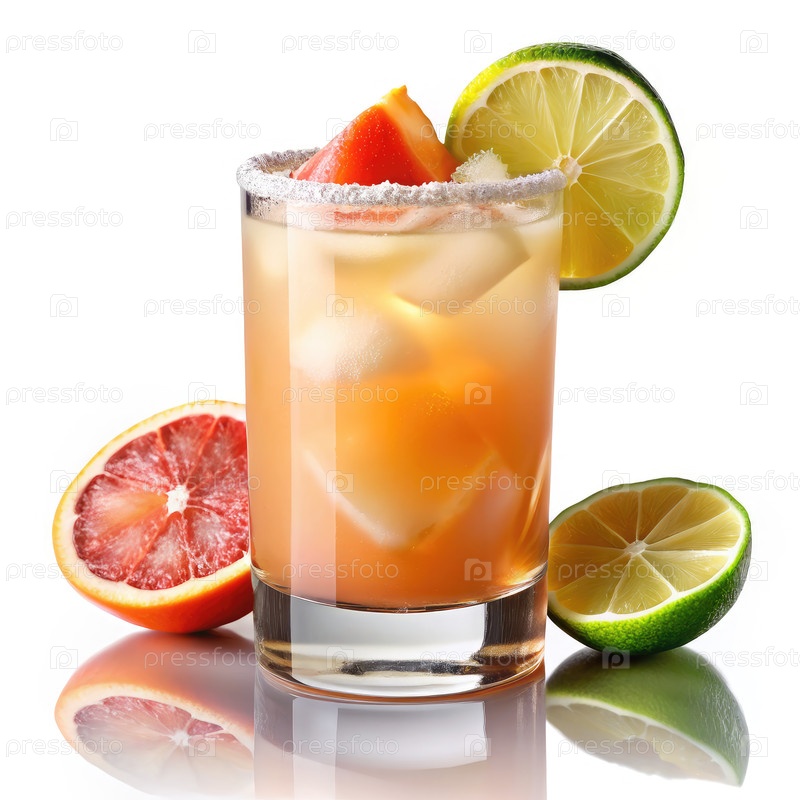 Классический коктейль Paloma с грейпфрутом и гарниром из лайма на белом фоне