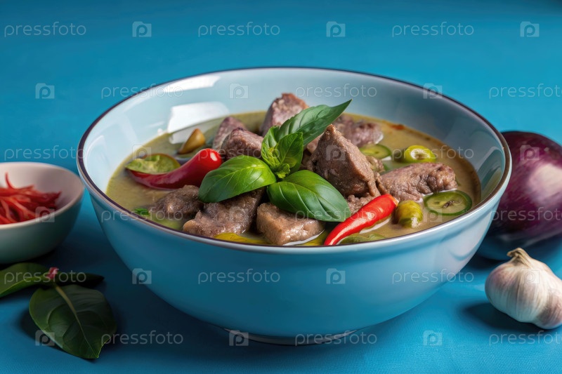 Сладкое говядиное зеленое карри с баклажанами, подаваемое в синей миске
