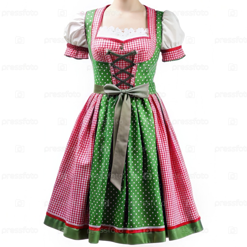 Традиционное зеленое и красное платье Dirndl с белой блузкой и зелёной лентой