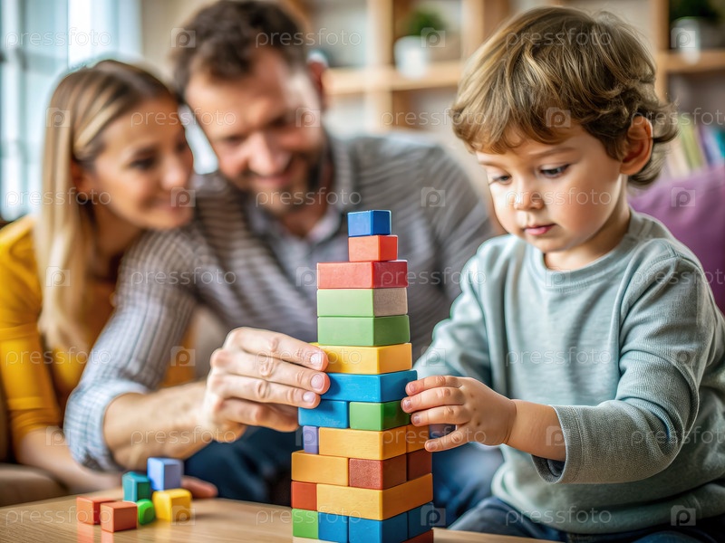 Маленький ребенок строит красочную башню из деревянных блоков, пока родители смотрят