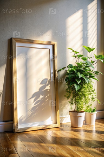 Пустой каркас на деревянном полу с растениями и солнечным светом