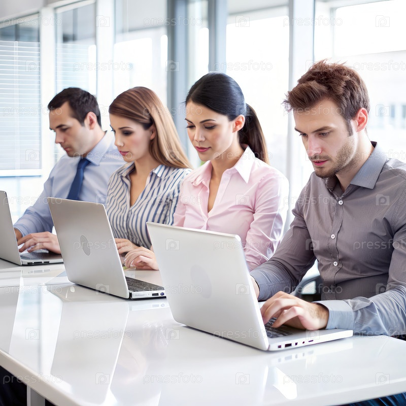 Четыре бизнес-профессионала работают на ноутбуках в современном офисе