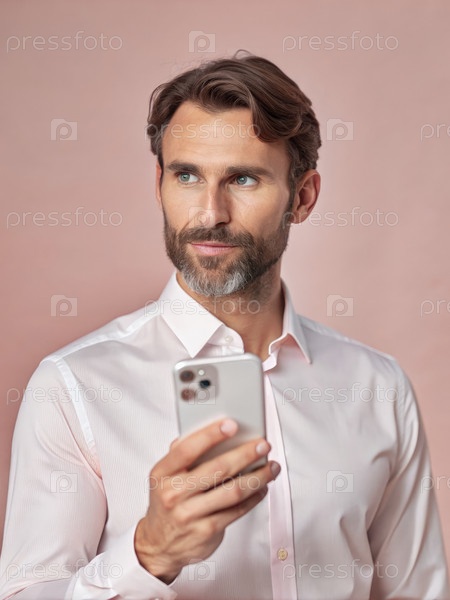 Мужчина в белой рубашке использует смартфон на розовом фоне
