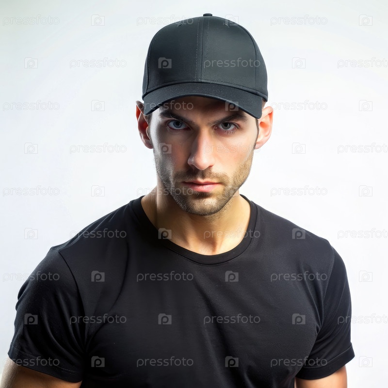 Человек в черной футболке и бейсбольной шляпе смотрит прямо на камеру