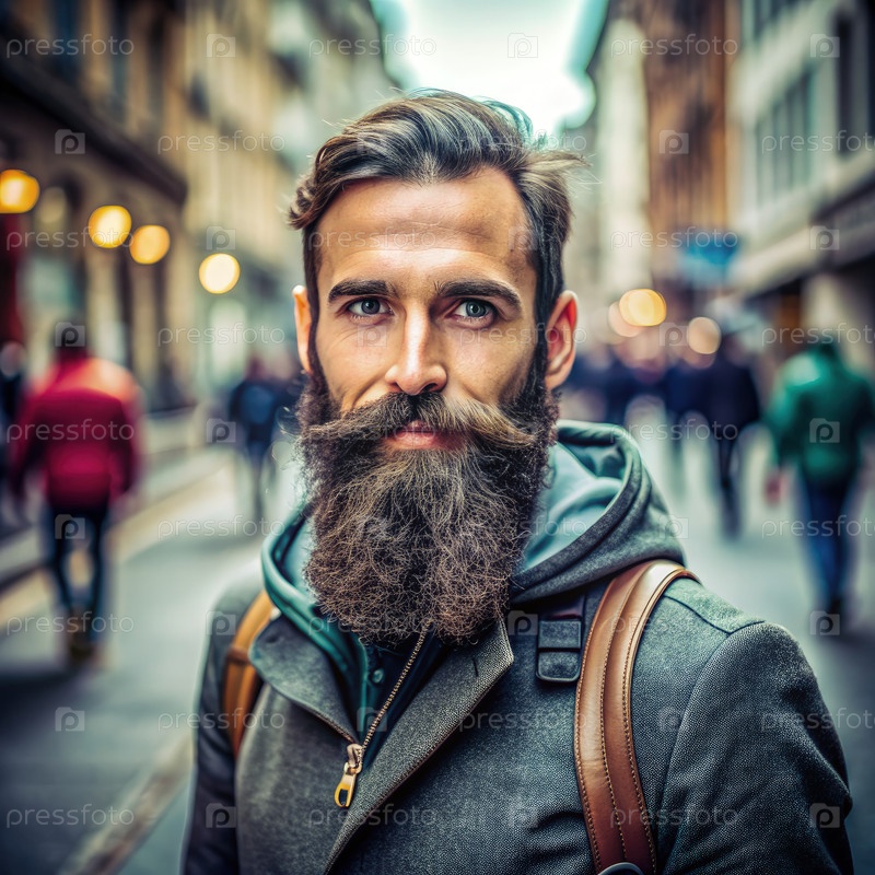 Человек с длинной бородой стоит на городской улице