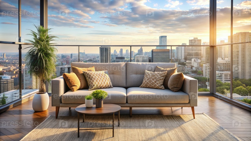 Уютный диван на балконе с видом на горизонт города при закате