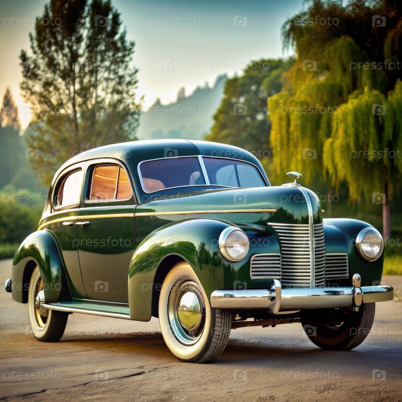 Винтажный зеленый седан припаркован на асфальтированной дороге перед деревьями