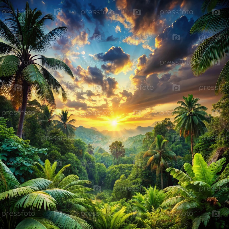 Золотой закат над пышным тропическим ландшафтом джунглей