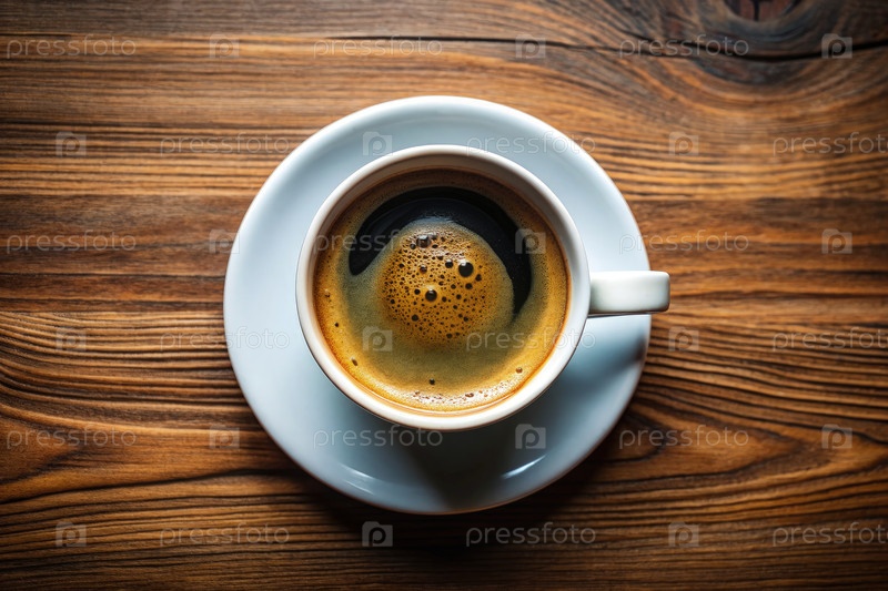 Вид белой чашки с черным кофе на деревянном столе