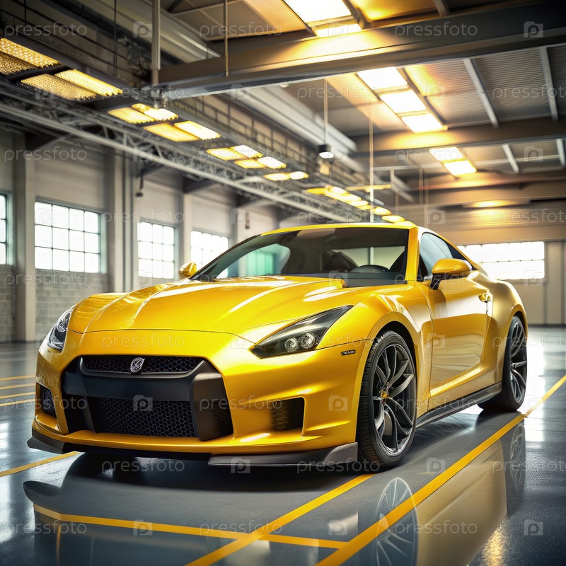 Желтый спортивный автомобиль, припаркованный в промышленной среде