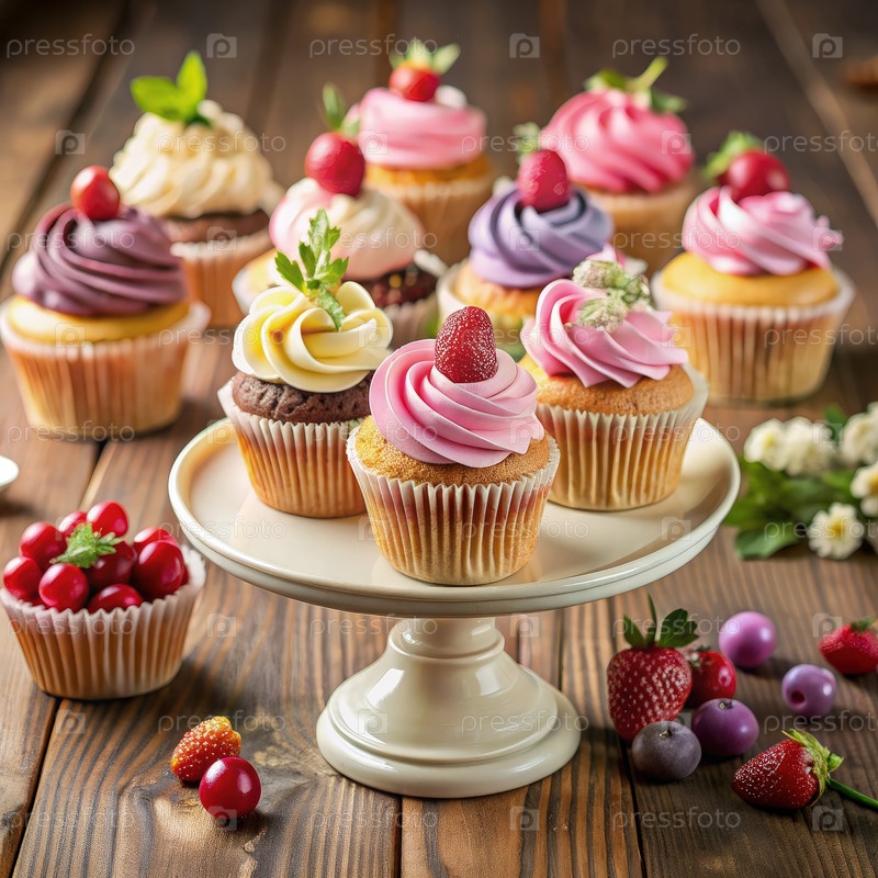 Цветные кексы на стойке белого торта