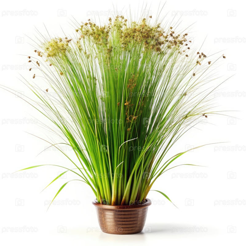 Растение Juncus Effusus в коричневом горшке на белом фоне