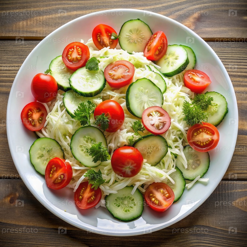 Салат из свежей капусты с нарезами огурцов и томатов на белой тарелке