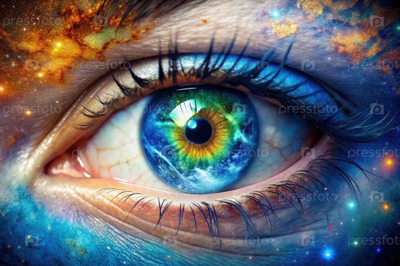 Близкий взгляд на человеческий глаз с Вселенной, отражающейся в зрачке
