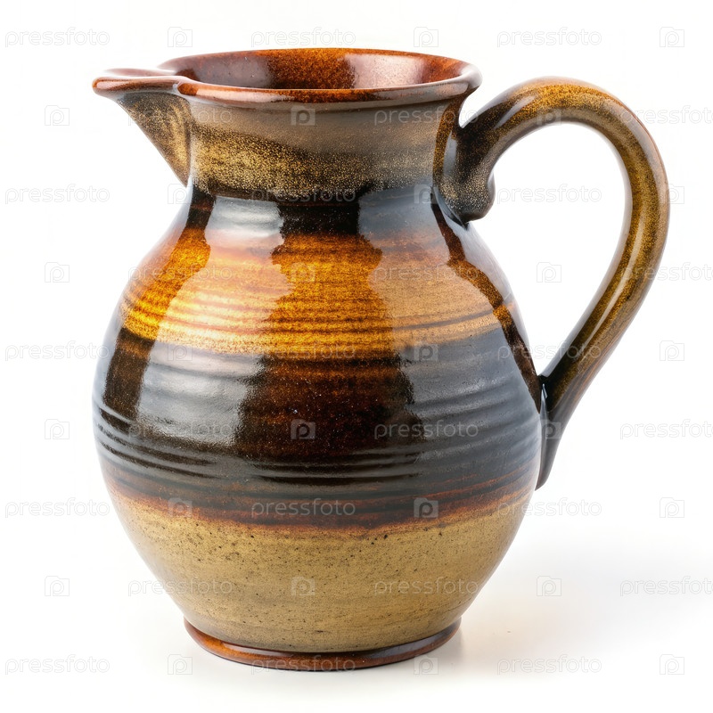 Коричневый и черный керамический кувшин с ручкой на белом фоне