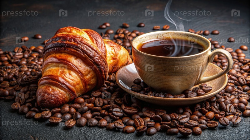 Парущая чашка кофе и свежевыпеченный круасан на кровати из кофейных зерен