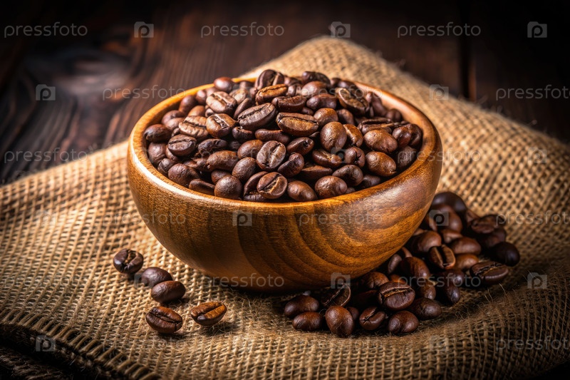 Жареные кофейные бобы в деревянной миске на бурлапской ткани