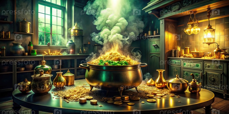 Мистическая кухонная сцена с пузыряющимся котлом и зеленым дымом