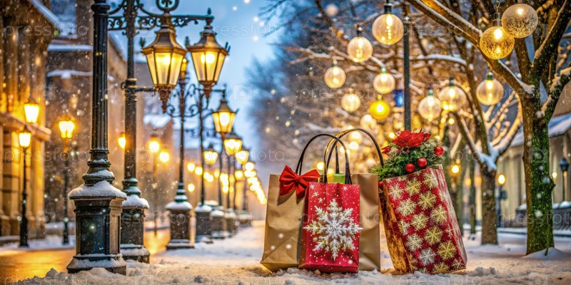 Рождественские сумки для покупок на Снежной улице со струнными огнями