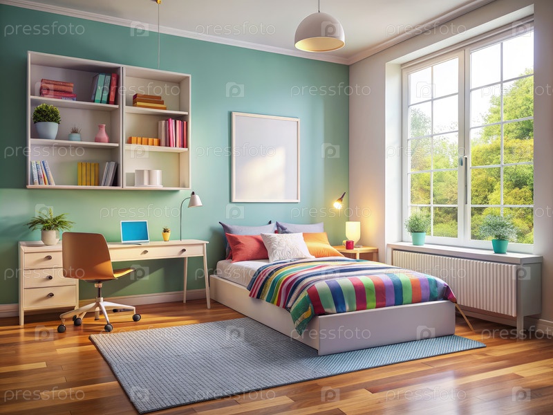 Яркий интерьер спальни для подростков с деревянным полом и большим окном