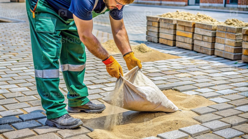 Строительный работник наливает песок между мостовыми на городской улице