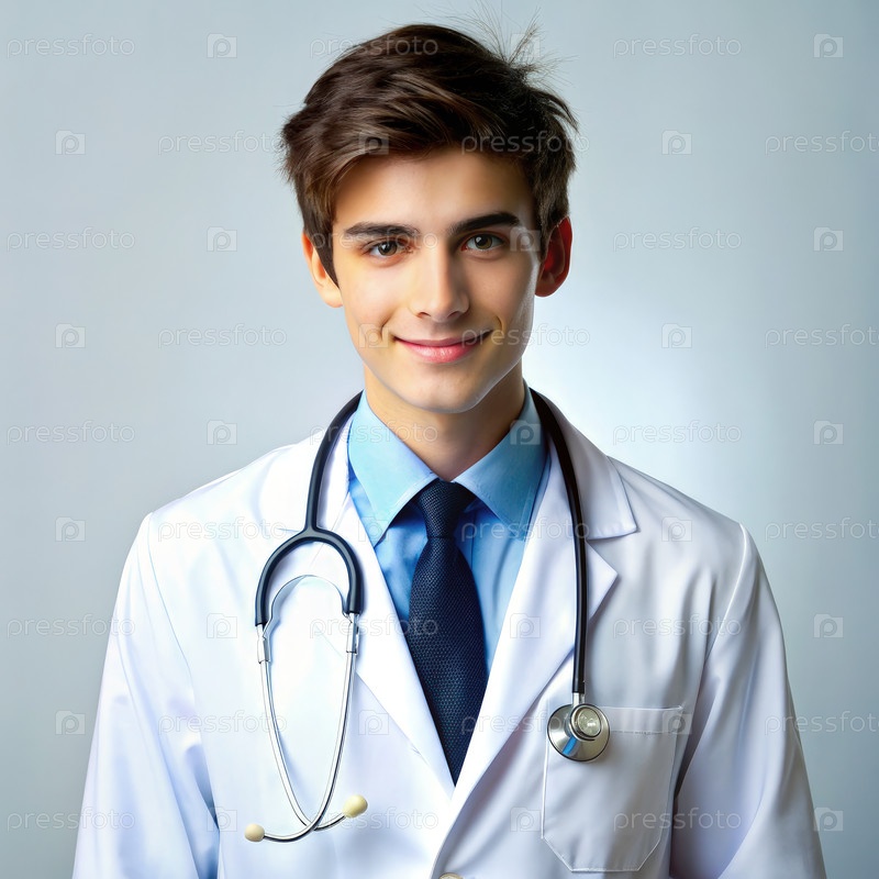 Молодой мужской врач, носящий белый халат и стетоскоп на светло-сером фоне