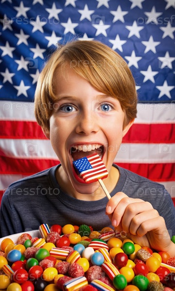 Молодой мальчик ест конфеты с американским флагом со столкой разнообразных сладостей напротив американского флага