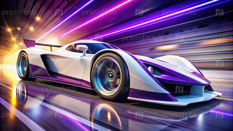 Белый и фиолетовый гоночный автомобиль пробегает через неонный туннель