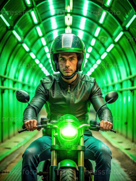 Молодой человек едет на мотоцикле через зеленый тоннель