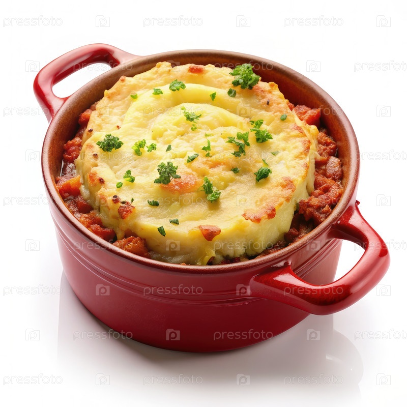 Красная блюда для выпечки, наполненная пирогом пастуха на белом фоне