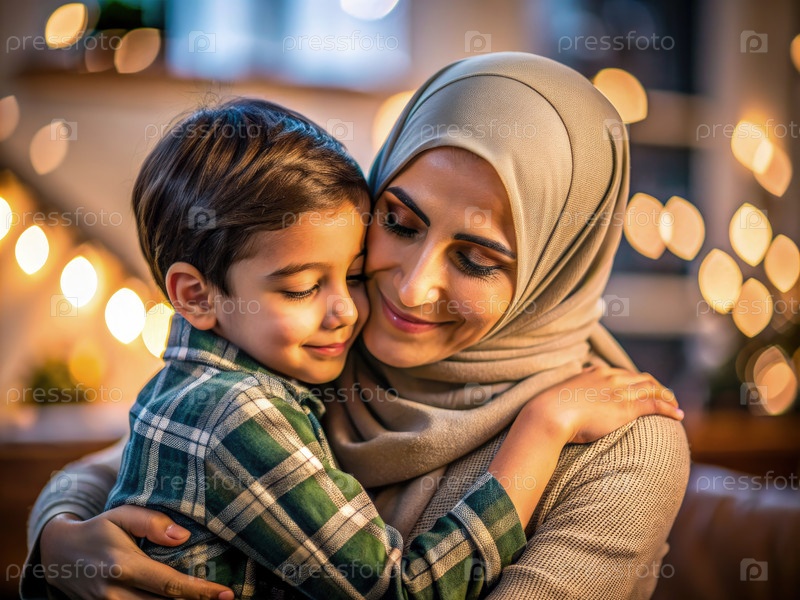 Мусульманская мать и сын обнимаются в тепло освещенном доме