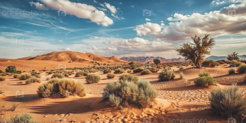 Пустынный пейзаж с катящимися песчаными дюнами и рассеянными кустами под голубым небом с пушистыми белыми облаками