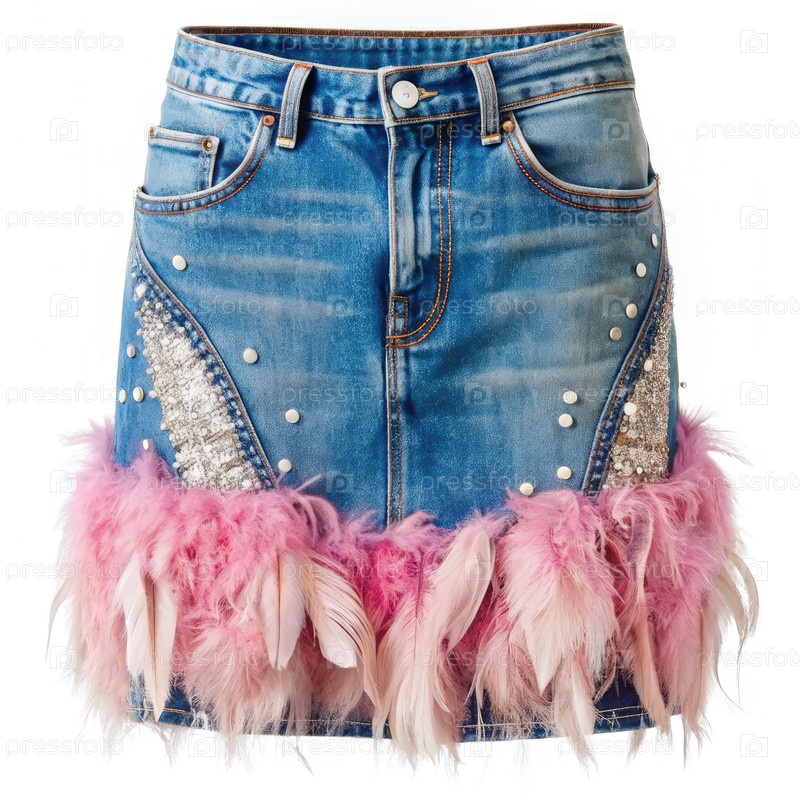 Разорванная джинсовая юбка с розовыми перьями и секвинами. генеративный AI