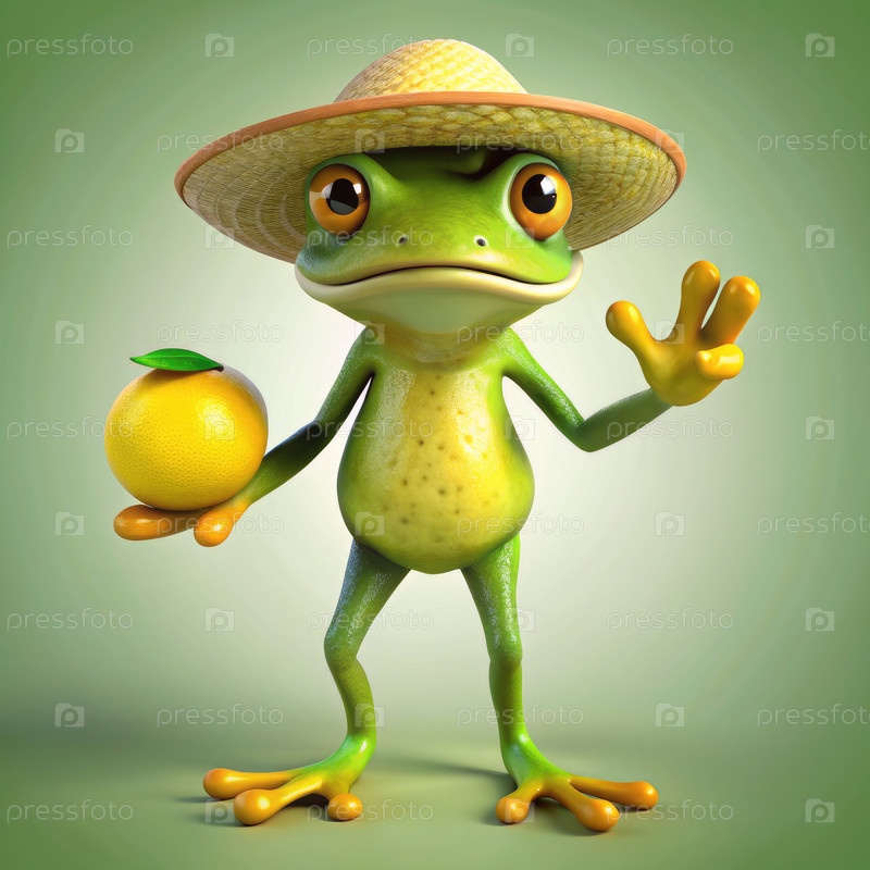 Анимационная лягушка в соломенной шляпе держит лимон