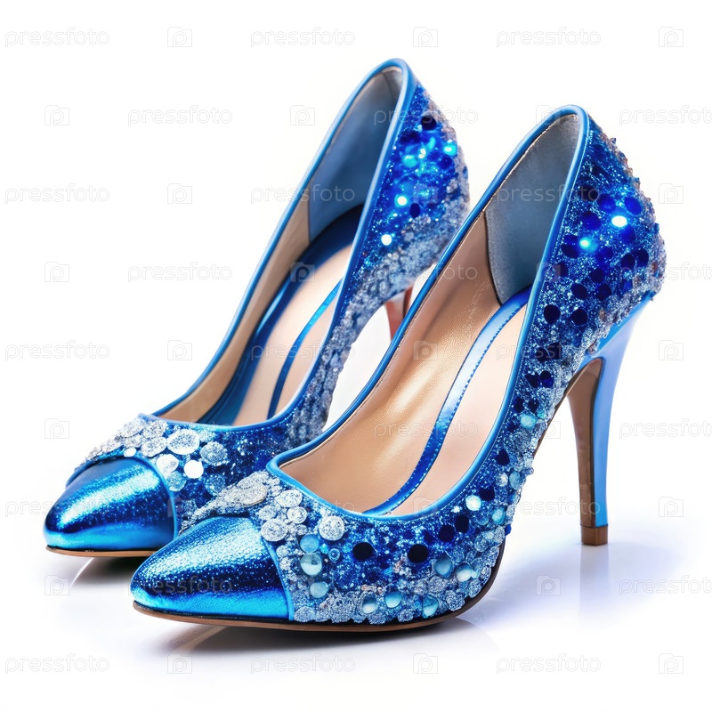 Пара обуви с синими хрустальными каблуками на белом фоне