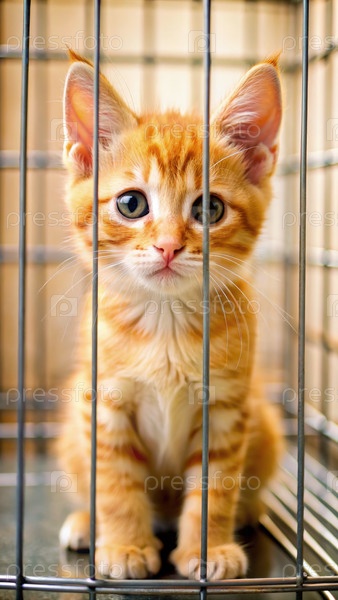 Печальный оранжевый котенок, содержащийся в проволочной клетке