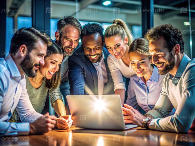 Группа коллег собралась вокруг ноутбука в офисной обстановке ночью