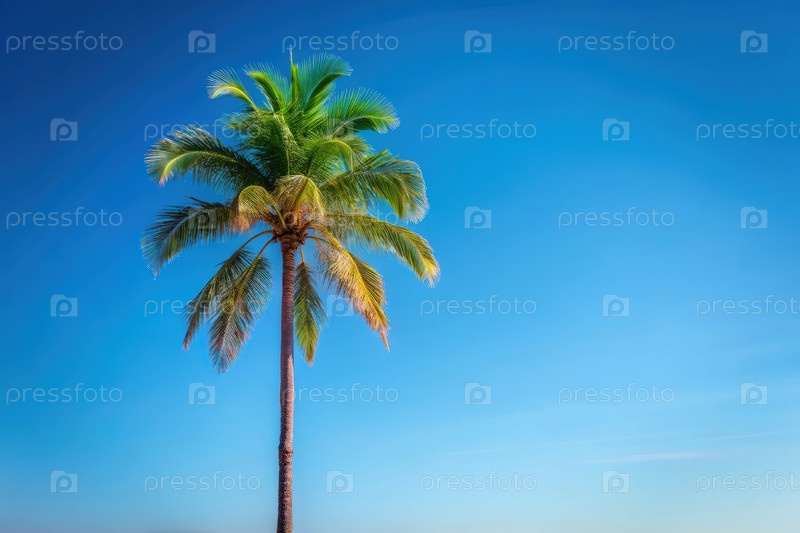 Одно пальмовое дерево стоит высоко на ясном голубом небе