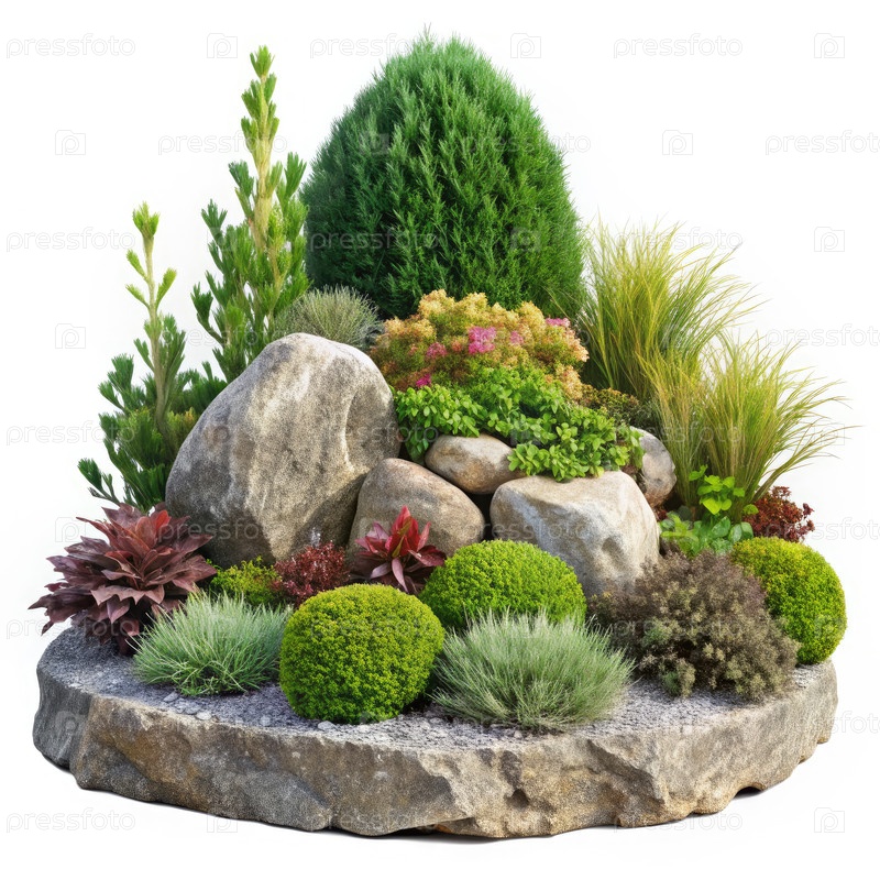 Каменная садовая кровать с разнообразными кустарниками и растениями