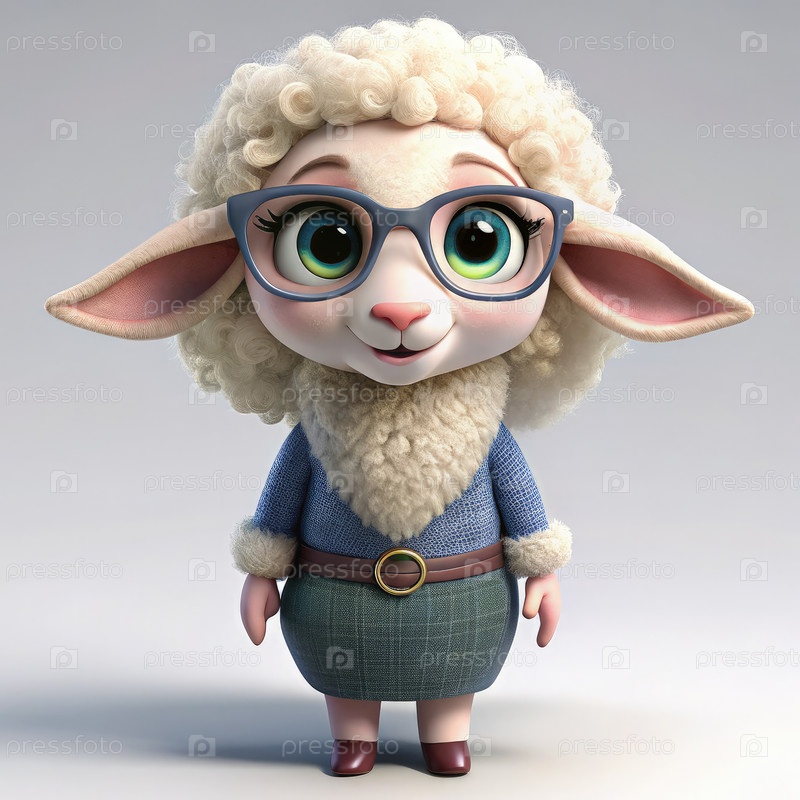 Улыбающаяся белая овца с очками стоит на сером фоне