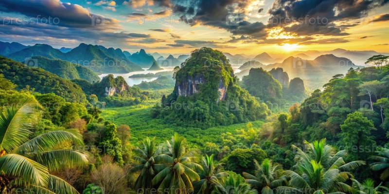Пейзаж пышного зеленого тропического дождевого леса на закате в Таиланде. генеративный ИИ