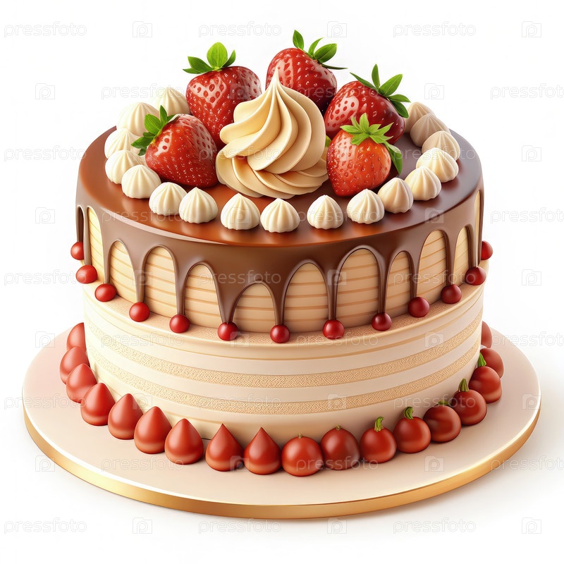 Двухуровневый шоколадный торт со клубникой и сливком на белом фоне